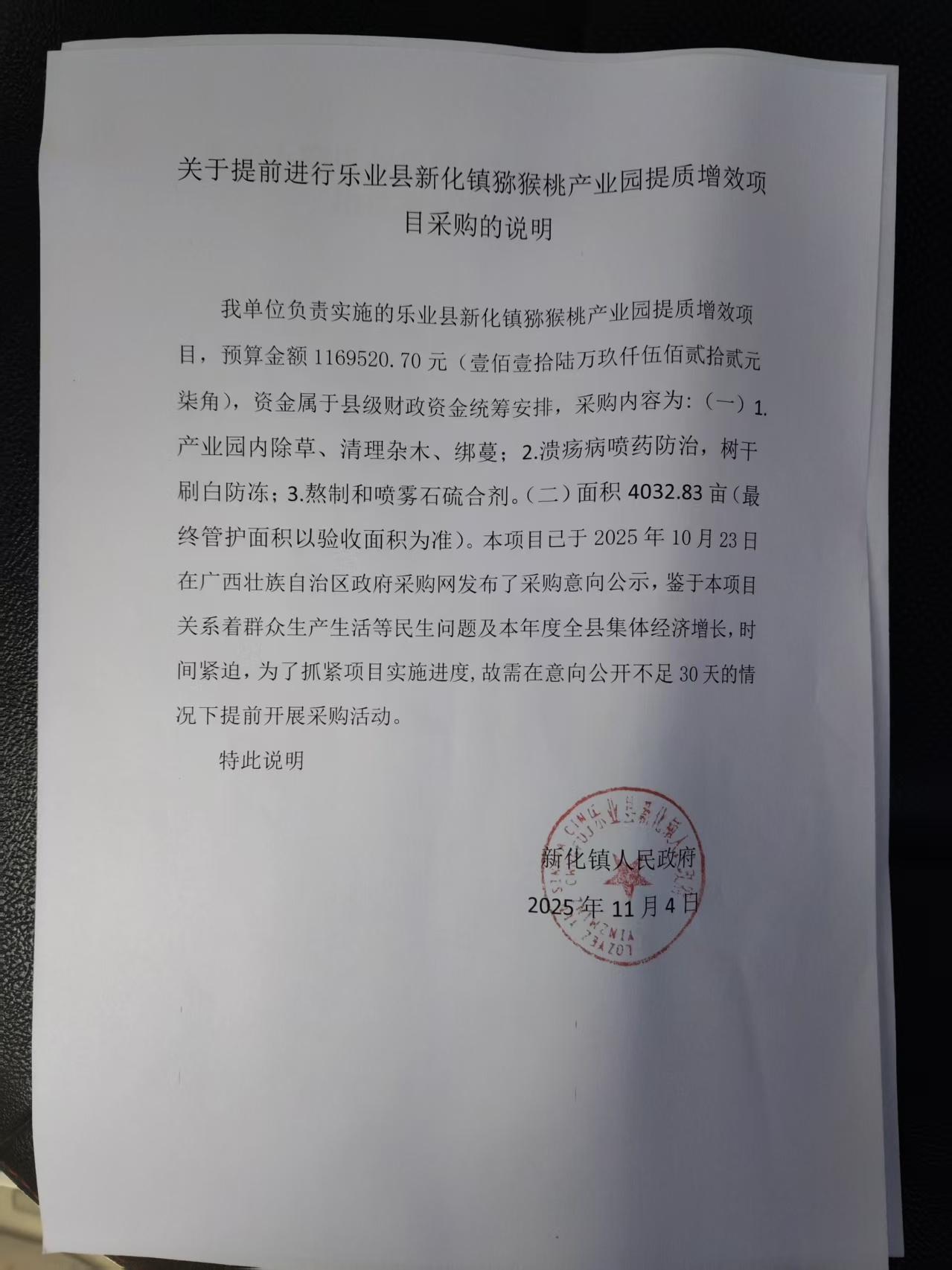 乐业县新化镇猕猴桃产业园提质增效项目采购项目的潜在供应商应在广西政府采购云平台(******/)获取采购文件,并于2025年11月18日 15:00(北京时间)前提交响应文件。