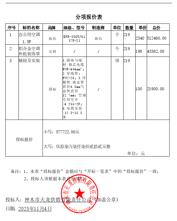 | 1 | 其他家具 | 教师宿舍空调 | 海信 | 详见分项报价表 | 1.00(批) | 577,722.00 | 577,722.00 |